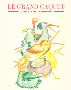 Le Grand Caquet est un cabaret, animé par une conteuse et un musicien. La soirée, thématique, se déroule comme une grande histoire, dans laquelle l’audience, avertie, est invitée à intervenir et inventer des bouts de récits. Cette soirée permet de mettre en œuvre de façon festive et artistique le travail des ateliers.